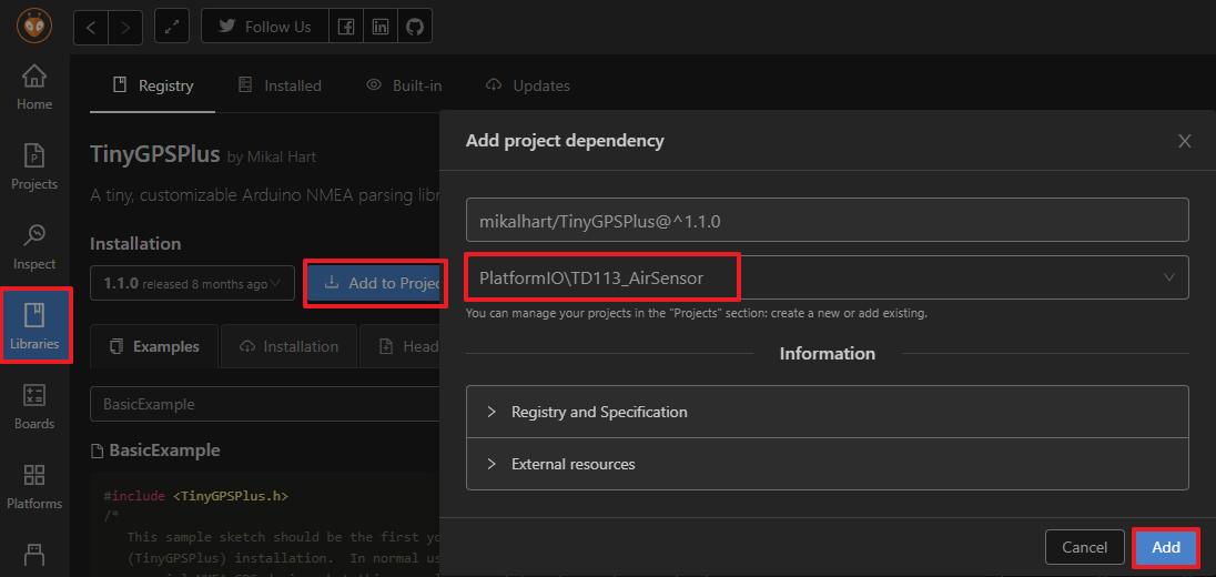 #include <TinyGPSPlus.h> 를 추가했는데 프로젝트에 해당 라이브러리가 없으면 PlatformIO - Libraries에서 라이브러리를 검색하여 추가하면 설치됩니다.