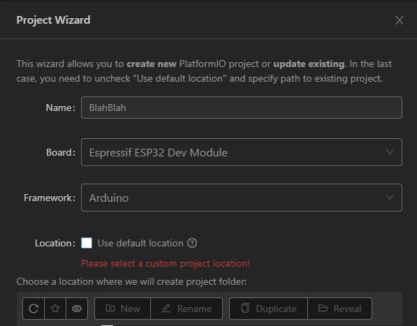 Location 항목을 체크하면 내 문서 PlatformIO 폴더에 프로젝트가 생성되고, 별도 위치에 저장하려면 체크 해제 합니다. 상위 폴더를 선택하고 Finish 버튼을 누르면 자동으로 프로젝트 이름으로 폴더가 생성됩니다.