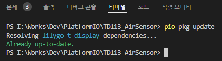 이미 라이브러리가 설치되어 있다면 패키지 업데이트 명령을 실행합니다. 터미널은 VSCode 터미널이 아닌, PlatformIO의 터미널을 실행해야 합니다.