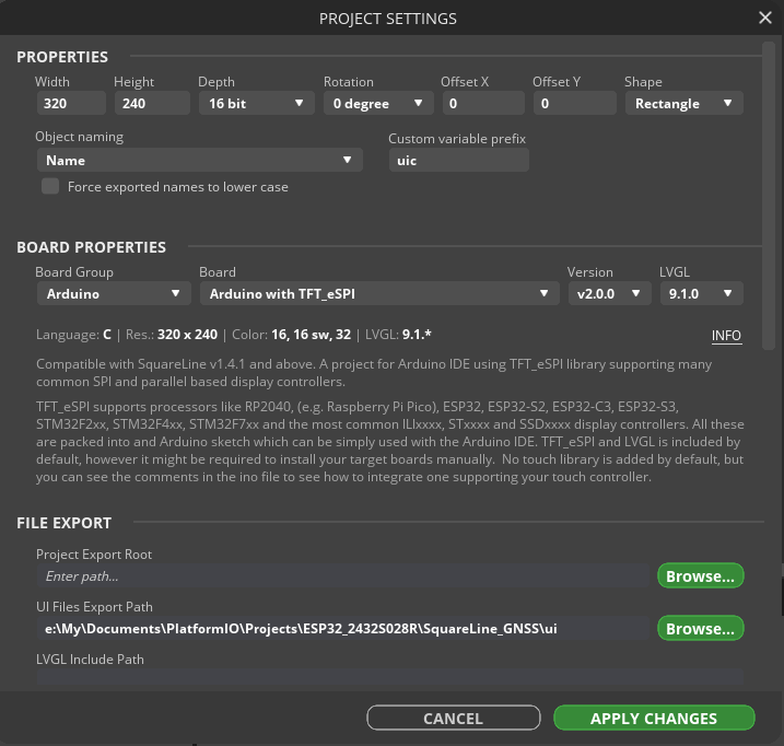 파일 내보내기 설정에서 UI Files Export Path는 PlatformIO 프로젝트의 src, include, lib 같은 연결 가능한 폴더로 지정합니다.