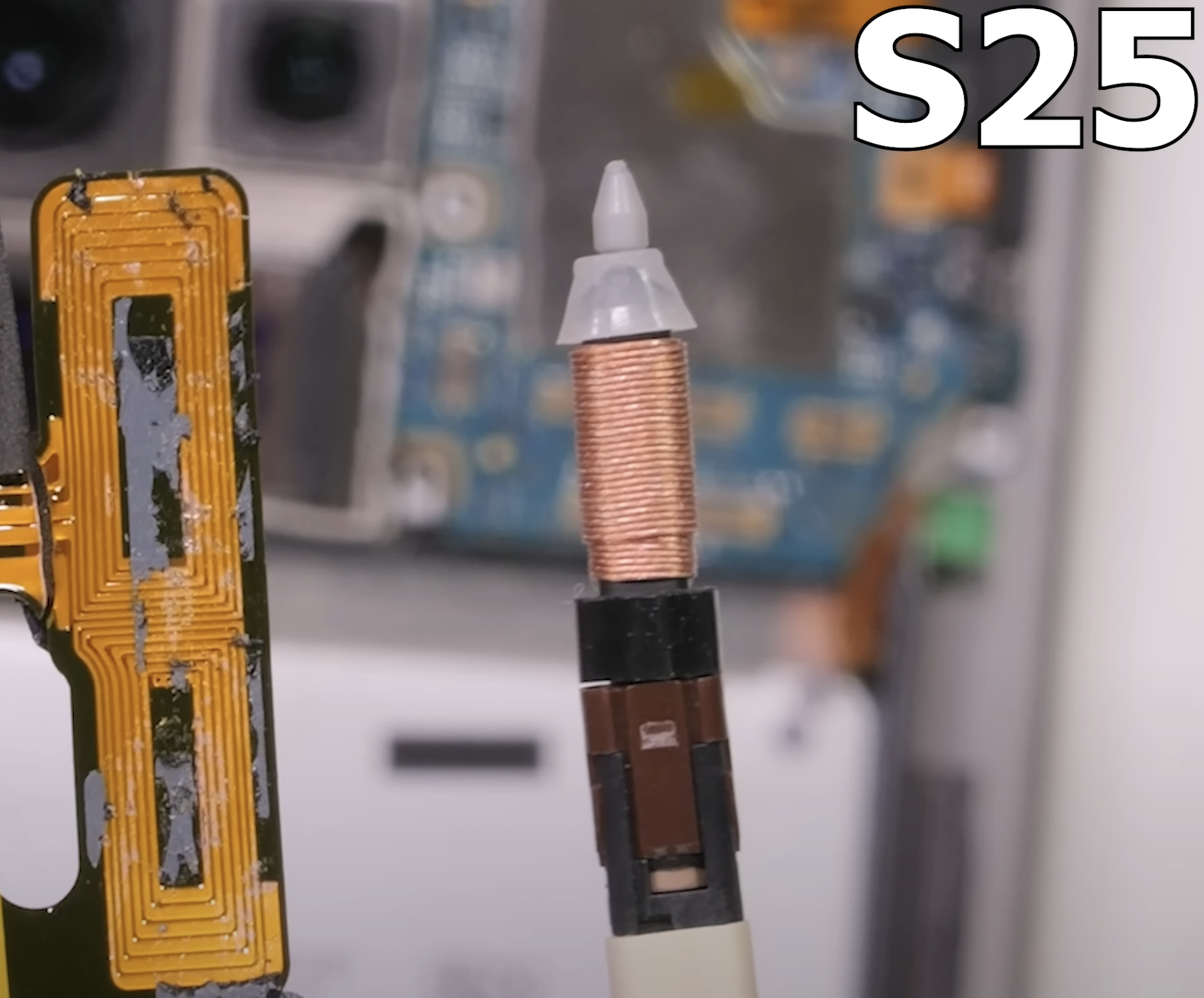 S25를 분해하면 S펜 슬롯의 끝 부분에서 무선 충전 코일을 발견할 수 있습니다. S25는 배터리가 내장된 S펜을 충전할 수 있습니다.