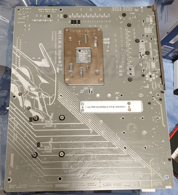 뒷면은 금속 플레이트가 2개 보입니다. 그래픽 카드 무게가 상당하기 때문에 탈착 중에 슬롯이 휠 수 있는데, 이 보드는 PCIe 5.0 슬롯을 금속으로 씌워서 보호해줍니다.