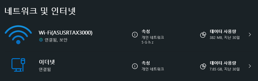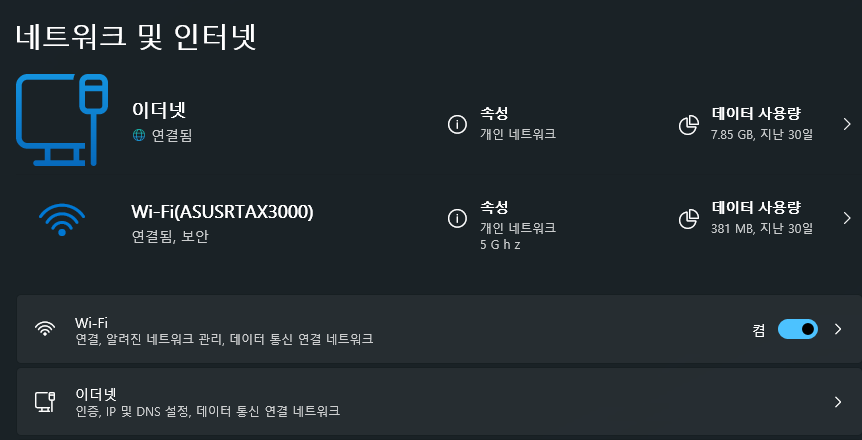 설정 - 네트워크 및 인터넷 페이지에서 유무선이 동시에 연결된 상태를 볼 수 있습니다.