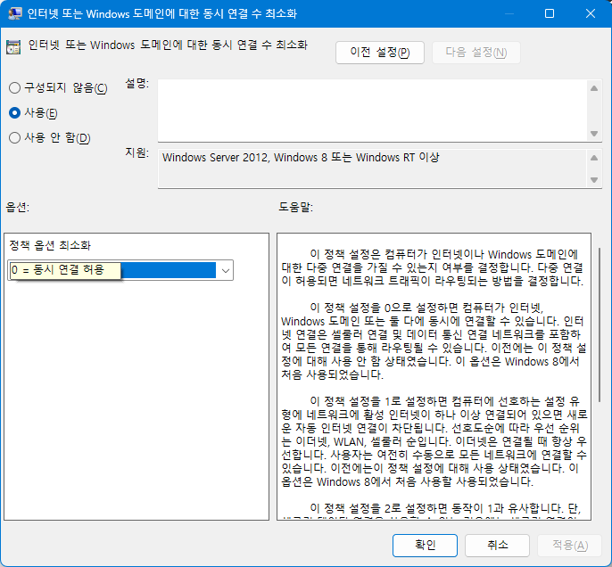 사용을 선택하고, 0 = 동시 연결 허용 항목을 선택합니다. 확인을 누르면