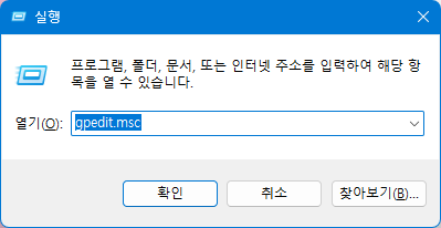Win+R 키를 눌러서 gpedit.msc 를 입력하여 로컬 그룹 정책 편집기를 실행합니다.