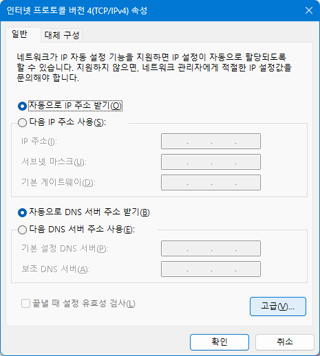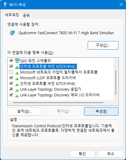 인터넷 프로토콜 버전 4(TCP/IPv4) 항목을 선택 후 속성 버튼을 누릅니다.