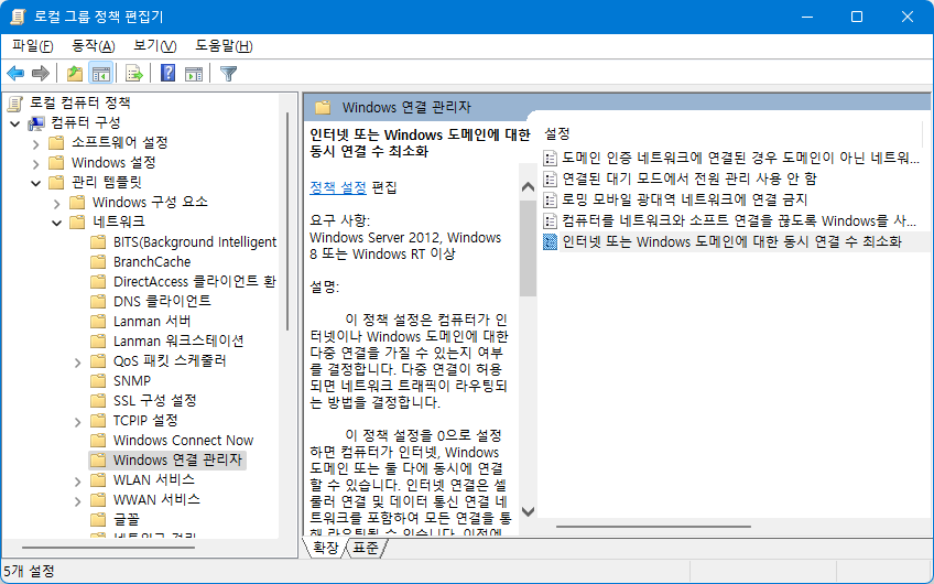 로컬 컴퓨터 정책 - 컴퓨터 구성 - 관리 템플릿 - 네트워크 - Windows 연결 관리자 위치로 이동합니다.