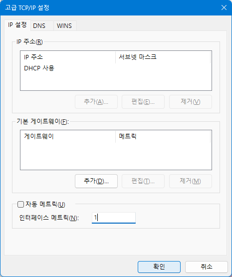 자동 메트릭 체크를 해제하고 인터페이스 메트릭 항목에 1을 입력합니다. 확인 버튼을 계속 눌러 속성 창까지 닫습니다.