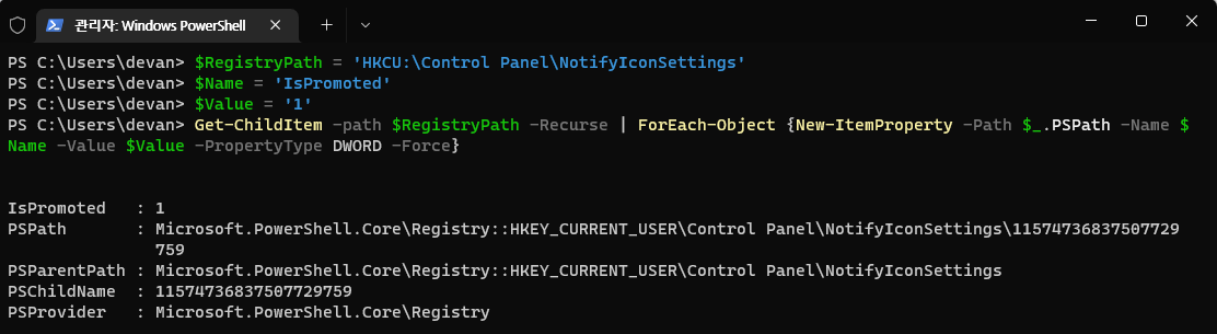 $RegistryPath = 'HKCU:\Control Panel\NotifyIconSettings'
