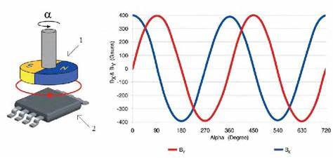앵글 센서는 자석의 회전각과 각속도를 측정하는 목적으로 사용되며 센서에 수평 방향으로 통과하는 자기력선의 방향을 측정합니다. 3축 센서를 사용하면 XYZ 방향을 알 수 있습니다. 극 방향을 알면 접촉식 홀센서로 정확한 측정을 할 수 있습니다.