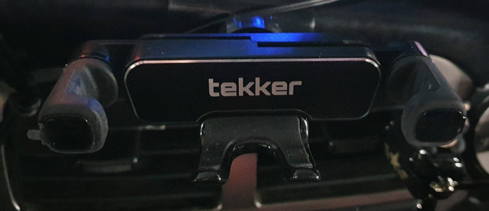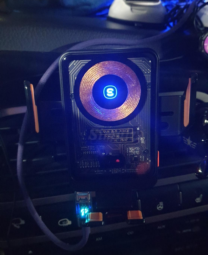 같이 구입한 시거 충전기를 꽂고, 전력(W) 표시가 되는 Type-C 케이블을 무선 충전기에 연결하였습니다. 무선 충전기는 택커(Tekker) 브래킷에 고정했습니다.