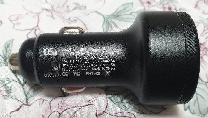 105W입니다. 차에서 폰을 2개 사용하기 때문에 Type-C 포트 2개와 USB A포트 1개가 있는 제품으로 골랐습니다.