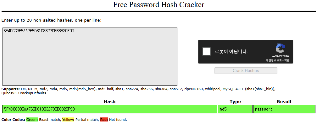 암호화된 문자열을 입력 후 Crack Hashes 버튼을 누르면 결과(Result)가 나타납니다.