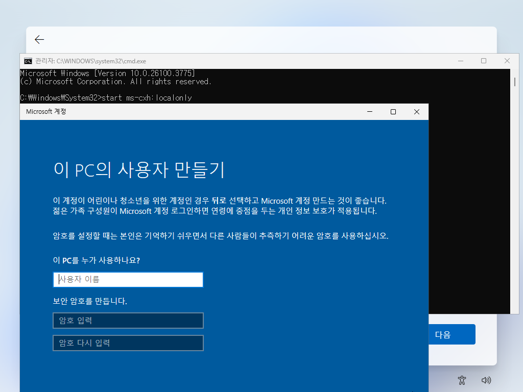 오프라인 환경이나 공용 PC라면 로컬 계정을 생성할 수 밖에 없습니다.