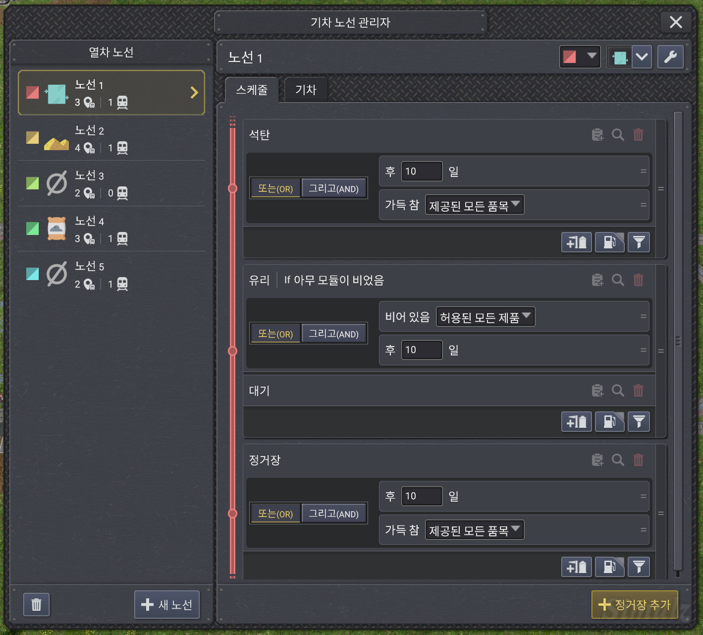 시간 설정을 OR 조건으로 추가하는 이유는 장시간 철로를 점거하는 것을 방지하기 위함이다. 시간과 관계없이 모든 적재물을 상하차 하려면 철로를 병렬로 여러 개 만드는 것이 좋다.