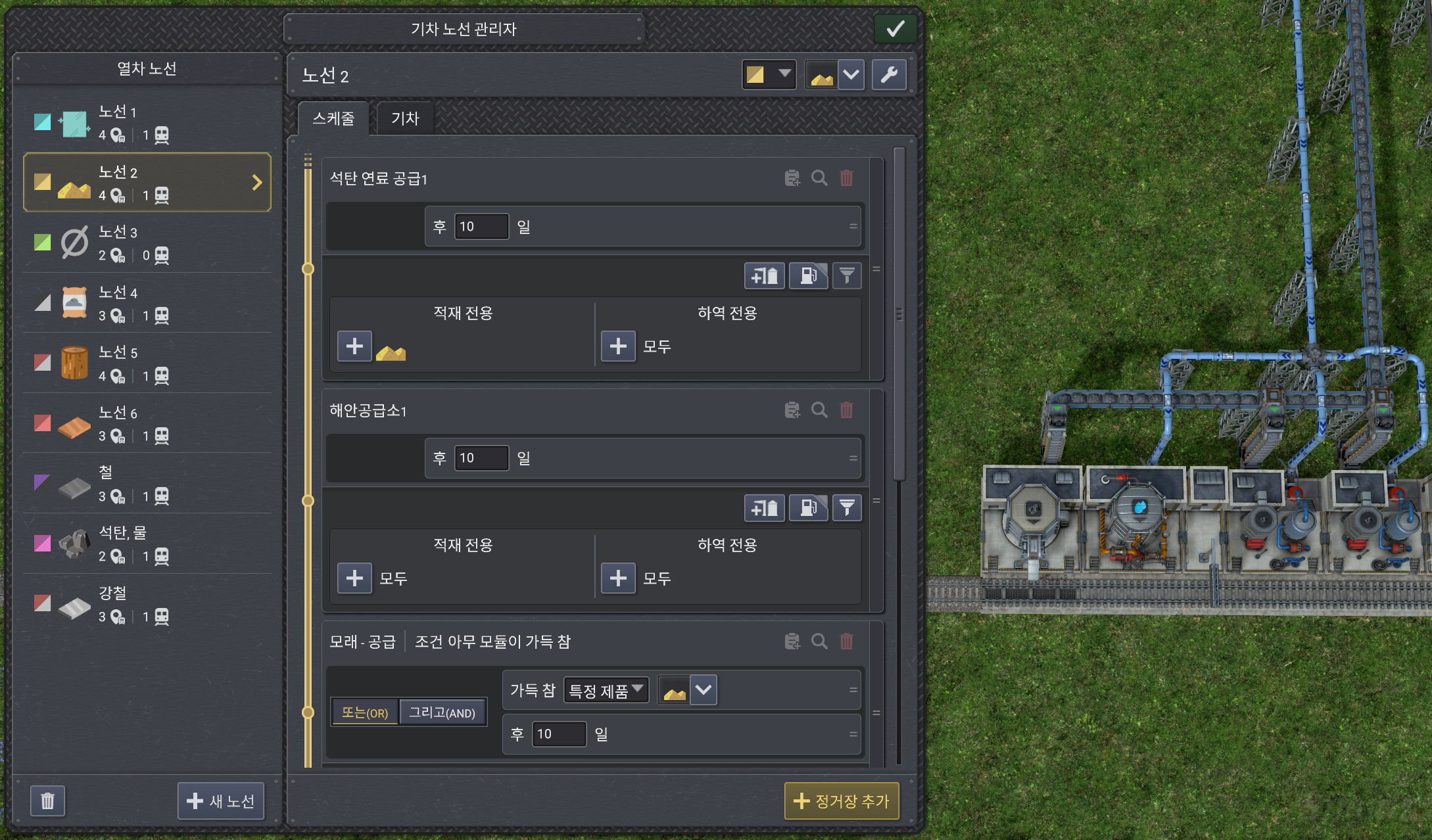 시간 설정을 OR 조건으로 추가하는 이유는 장시간 철로를 점거하는 것을 방지하기 위함이다. 시간과 관계없이 모든 적재물을 상하차 하려면 철로를 병렬로 여러 개 만드는 것이 좋다.
