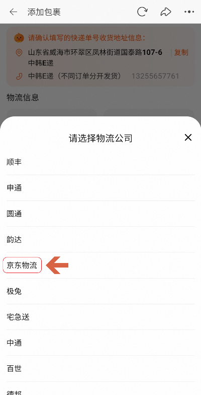 ⬆️위에서 주문한 상품은 기타로 표시되어 其他를 선택해야 하는데, JD물류 송장으로 표시됐기 때문에 京东物流를 선택했습니다. 응? 중국에도 경동화물이 있네🤣