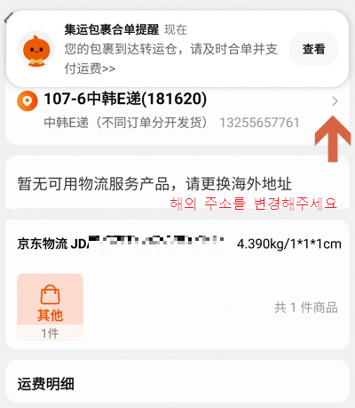 타오바오에서는 배송 중이지만 배대지에는 이미 도착했기 때문에 배송비를 결제해봅니다.🤣