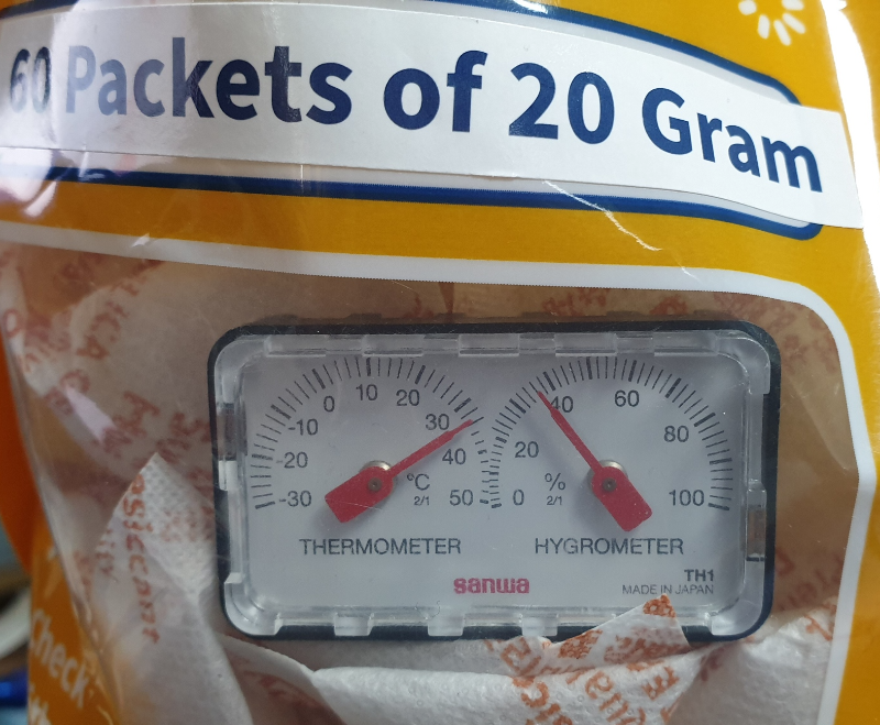 실내 습도는 에어컨을 켜면 28℃ 설정 시 50%까지 습도가 낮아지지만, 제품 보관 가방이나 서랍은 공기가 거의 통하지 않기 때문에 실리카겔을 따로 넣어줘야 합니다.