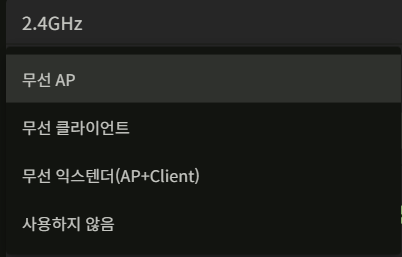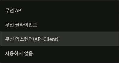 ipTIME 익스텐더 설정 페이지에서 무선 AP로 설정해야 합니다.