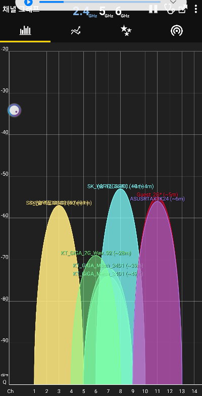 제일 먼저 해야할 것은 무선 라우터의 전파 강도를 측정하는 것입니다. 휴대폰에 WiFi Analyzer 앱을 설치 후 2.4GHz 주파수의 채널을 측정하면 됩니다.