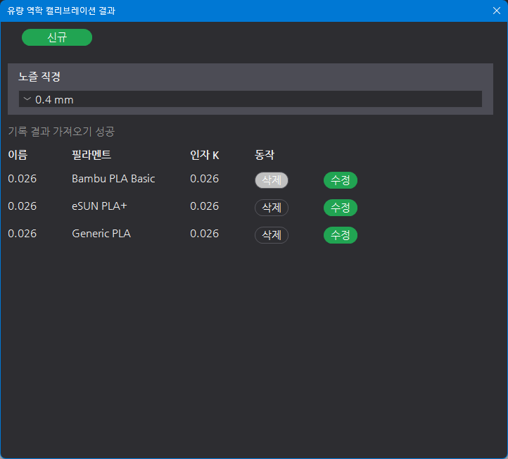 PLA는 K상수가 0.02이고, PETG는 0.04입니다.