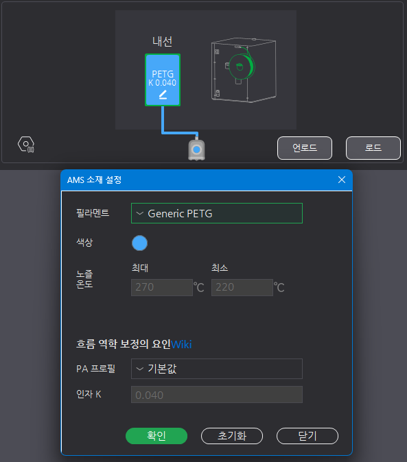 장치에서 설정하는 필라멘트 설정은 색상, 노즐 온도, K 상수입니다.