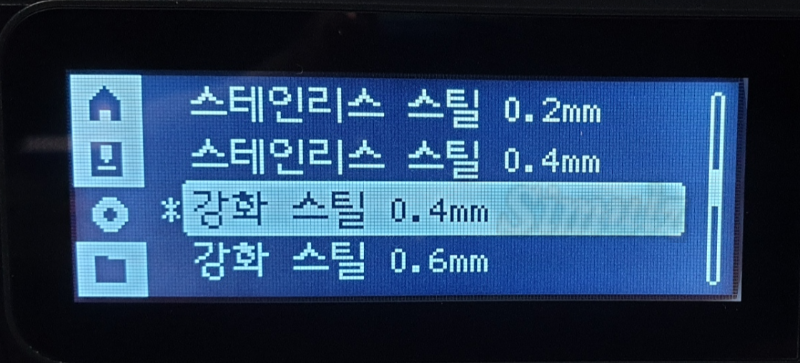 노즐 종류 및 구멍 크기는 프린터 설정에서 변경하면 됩니다.