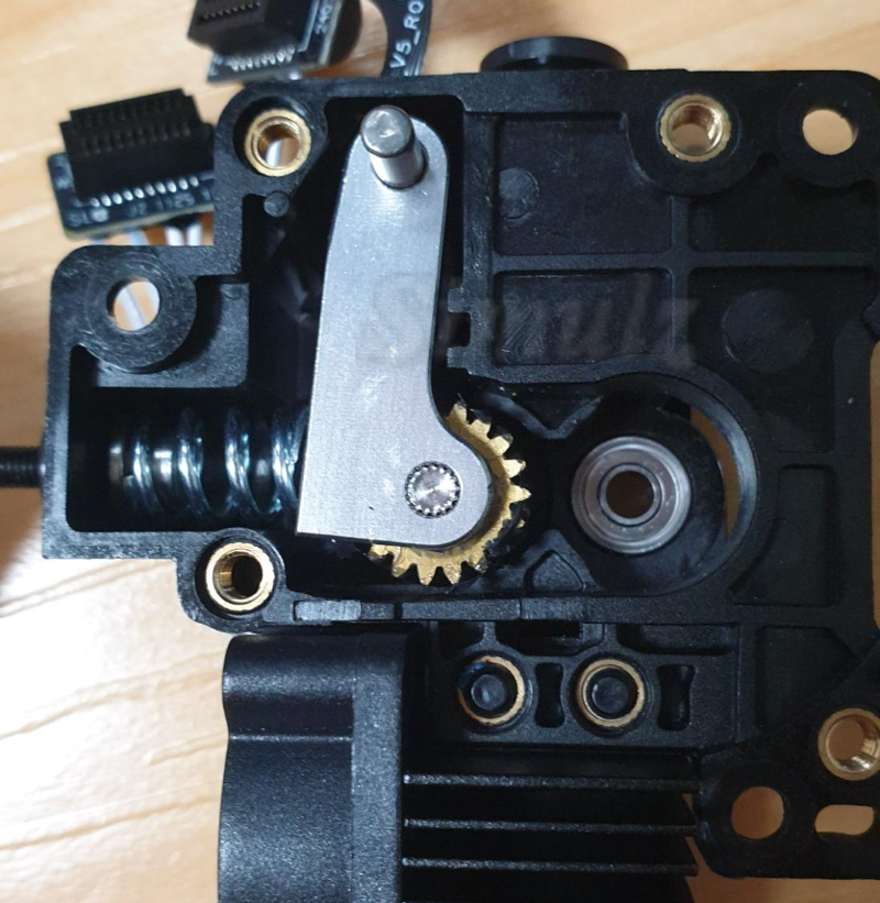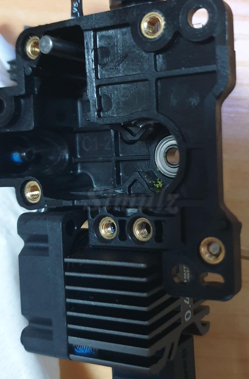 그 옆에 보이는 작은 톱니 기어가 필라멘트를 밀고 당기는 역할을 하며, 카본에 의해 손상이 됩니다.