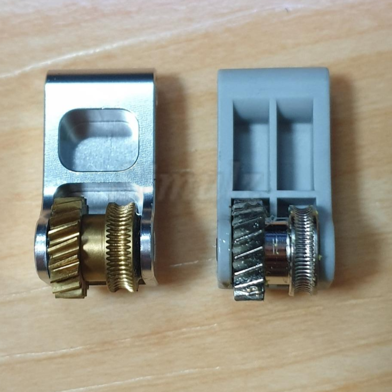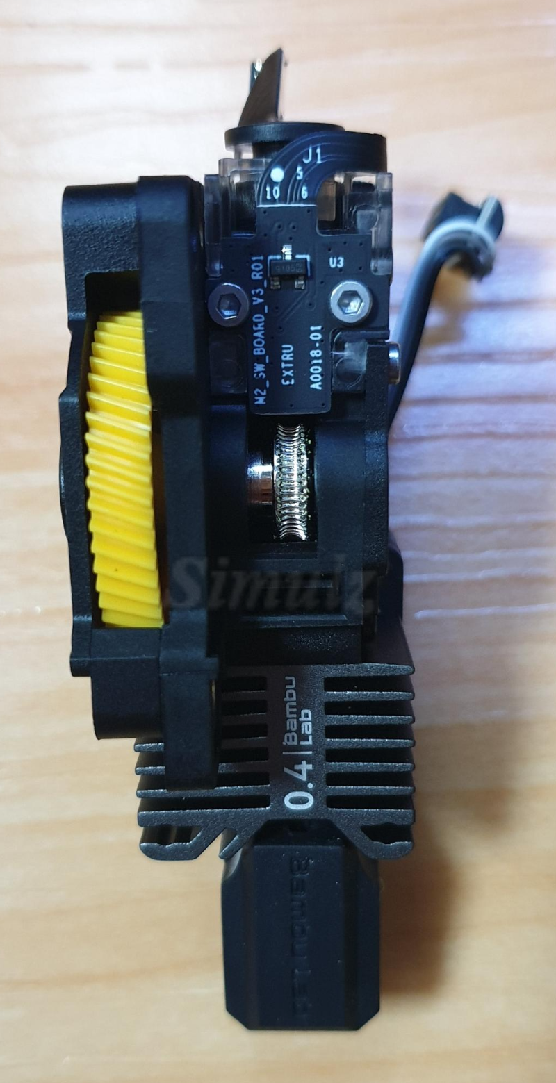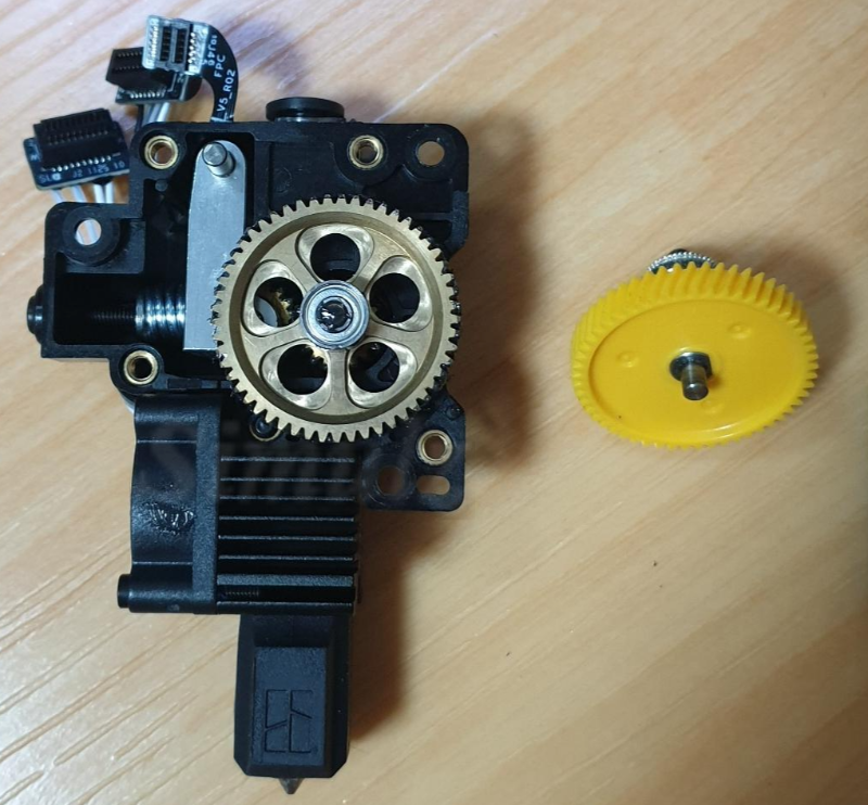 뱀부랩 순정은 필라멘트가 닿는 톱니만 금속이고, 스텝 모터의 금속 기어와 마찰하는 노란색 플라스틱 기어는 점점 뭉개질 수 있습니다.