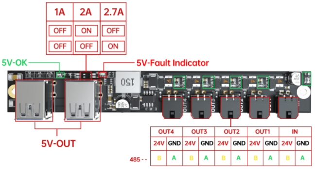 4Pin 커넥터는 클립이 있는 방향 2개가 24V 전원이며, 나머지 두 개는 RS485 데이터 통신용입니다.