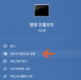 cmd를 관리자 권한으로 실행합니다.