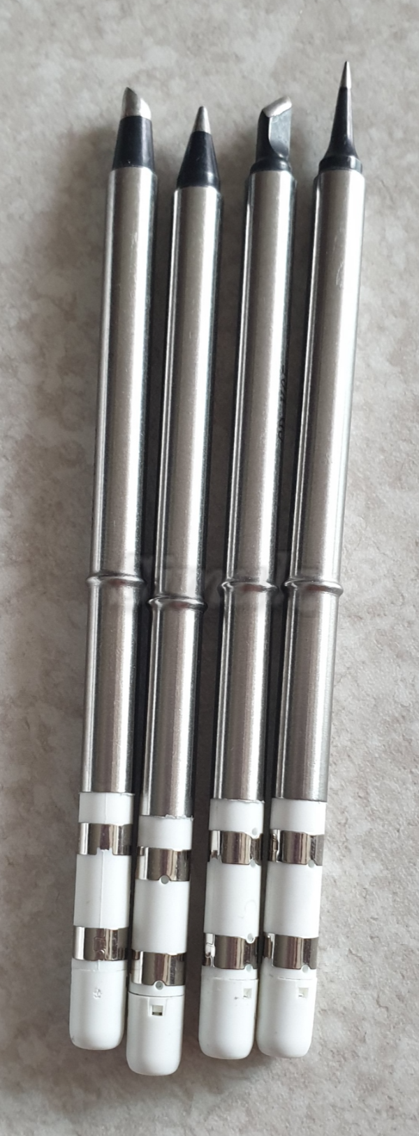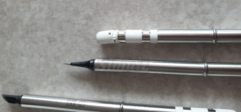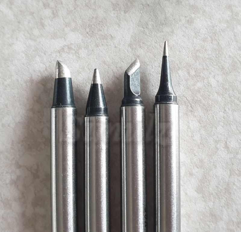 납이 묻어있는 인두팁들. 흔한 형태의 길다란 세라믹 인두팁입니다. 제일 많이 사용하는 팁은 역시 칼날 팁!🤩