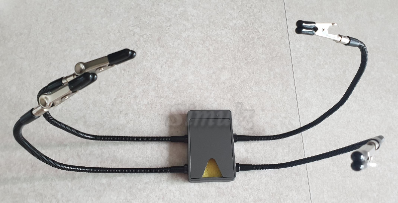 상자 안쪽에는 케이블 두 개, 납, 금속 받침대가 있습니다.