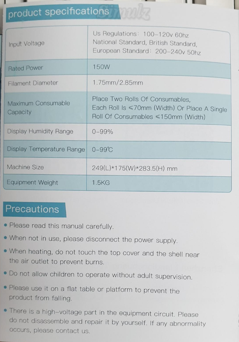 The SH02 Filament Dryer Box ensures optimal filament performance with advanced drying technology. 150W 360°PTC surround smart heating; Suitable for fast drying of all filaments. You can easily adjust the ideal temperature for different temperature and hum