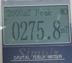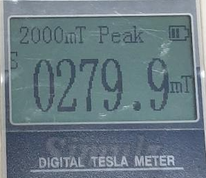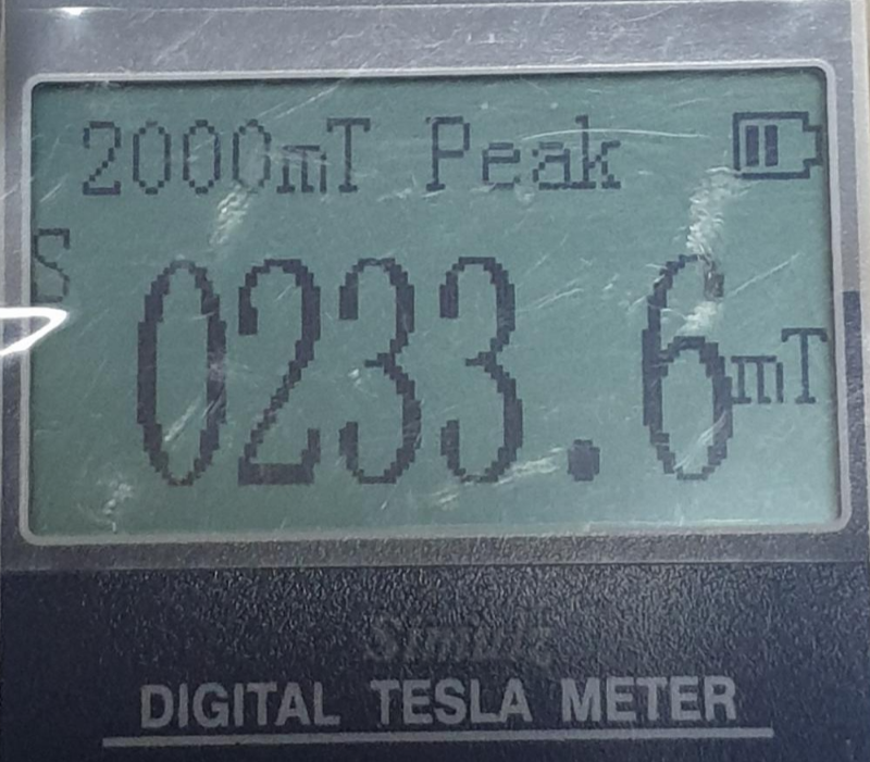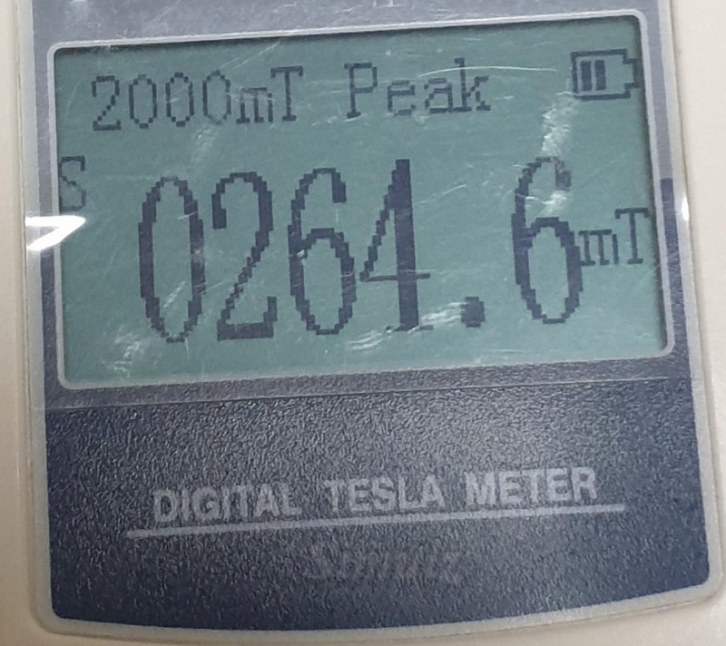 자속밀도 측정기로 측정을 해보니 뒷면을 기준으로 왼쪽 자석은 2646 가우스, 오른쪽은 2336 가우스로 측정되었습니다.