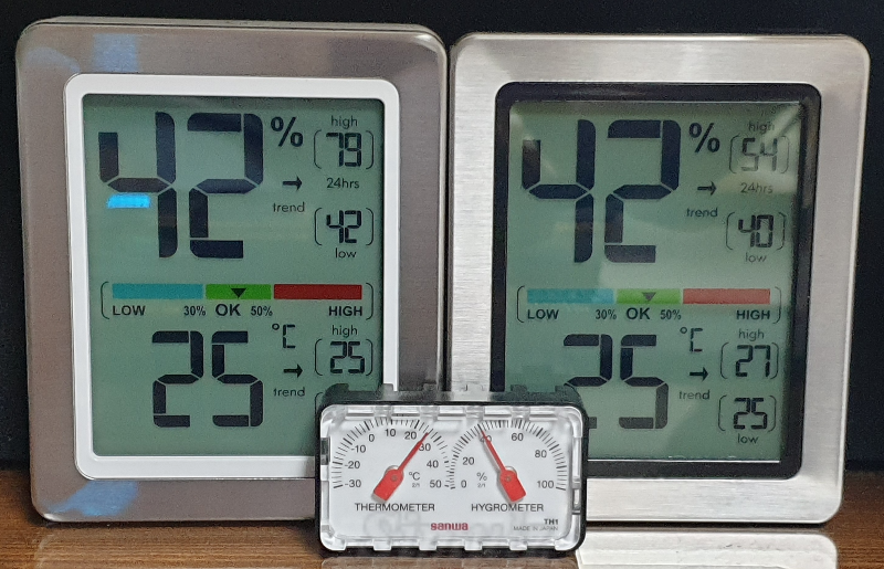 가운데 아날로그 온습도계는 4만 원대의 일본산 산와 제품입니다. 기준 온도계로 사용 중이며, 온도는 전부 25도이며 상대습도는 노바리빙 제품이 5% 높게 측정되었습니다.