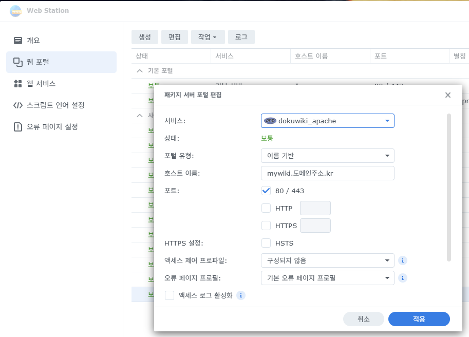 웹서버, 스크립트, 주소 설정을 위해 웹스테이션에서 웹포털로 설치합니다.