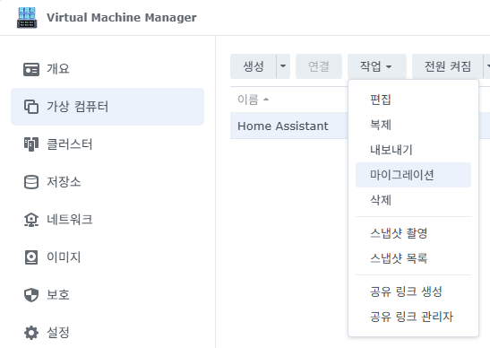 가상 컴퓨터를 종료하고 작업➡️마이그레이션을 누릅니다.