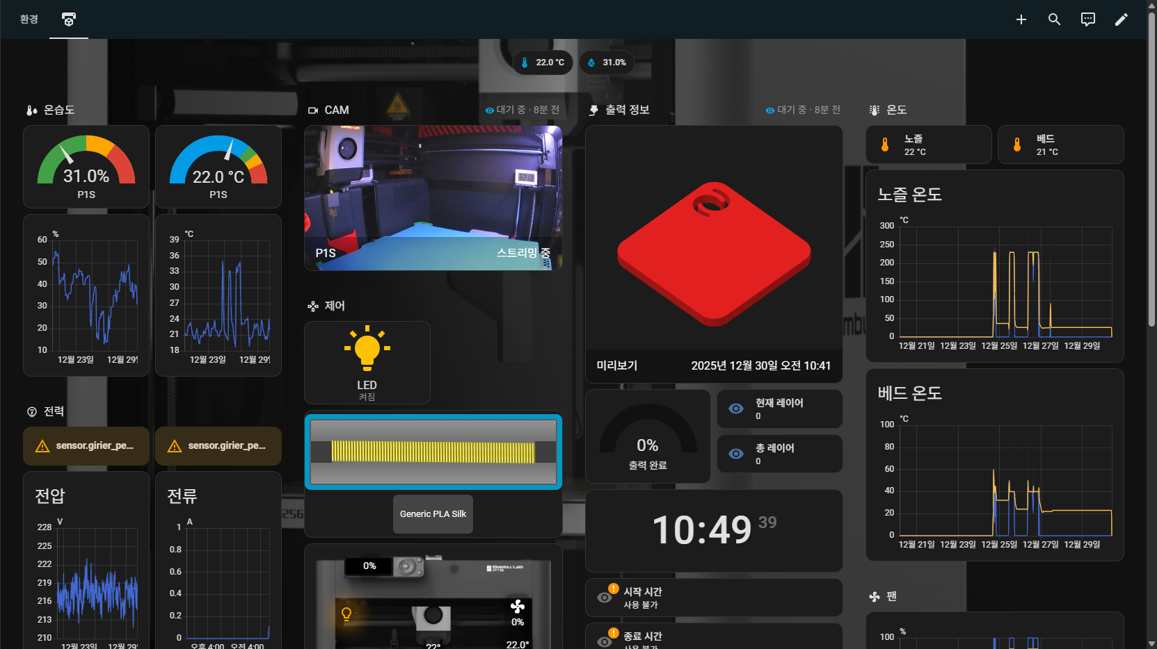 3D 프린터를 모니터링할 때 Home Assistant를 사용합니다. Tuya 등 각종 기기와 연동하여 자동화할 수도 있습니다.
