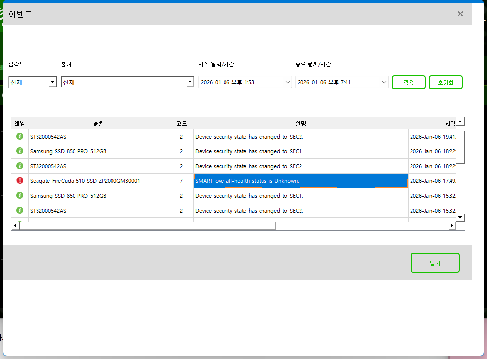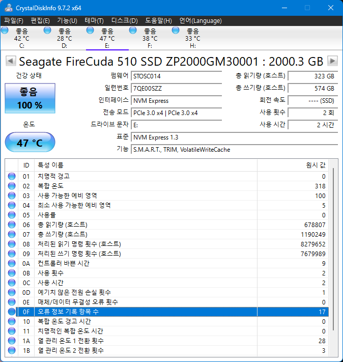 시게이트 510 SSD는 1시간 짜리가 오류 기록 8이 조회되었으며, 2시간 째는 17이 기록되었다. 🤬