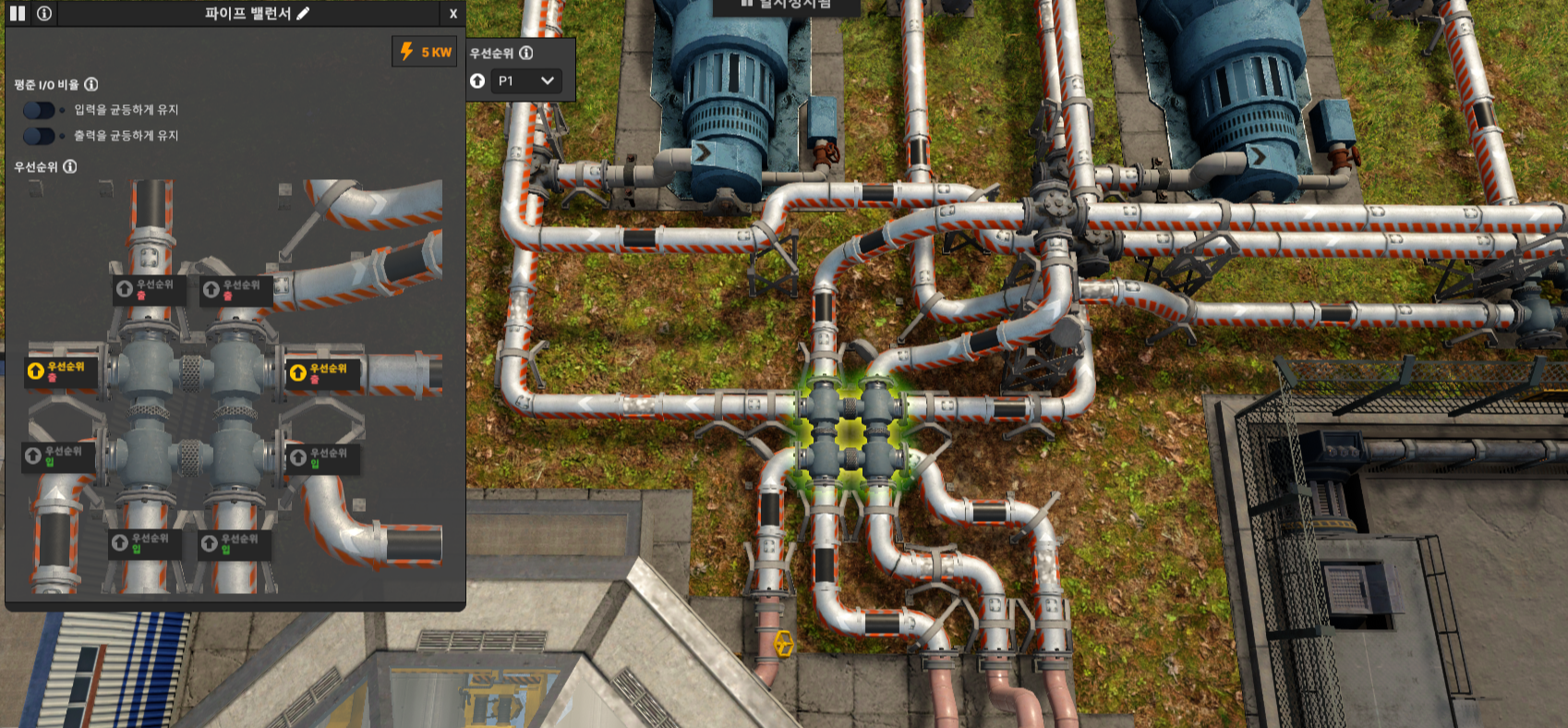 발전소에서 나온 고압 증기를 고압 터빈으로 우선적으로 보내고 남은 증기는 냉각탑으로 보내기 위해 파이프 밸런서를 사용했다. 원자력 발전소는 사이클 주기가 길기 때문에 실제로는 필요 없다. 고압 터빈의 소모가 더 빠르기 때문에 증기를 내보낼 필요가 없다. 이럴 때는 파이프 밸런서를 제거하거나 냉각탑으로 가는 파이프를 일시 정지하면 된다. 배출 주기가 짧은 건물에는 파이프 밸런서를 사용하는 것이 좋다. (현실이던 게임이던 안전제일)